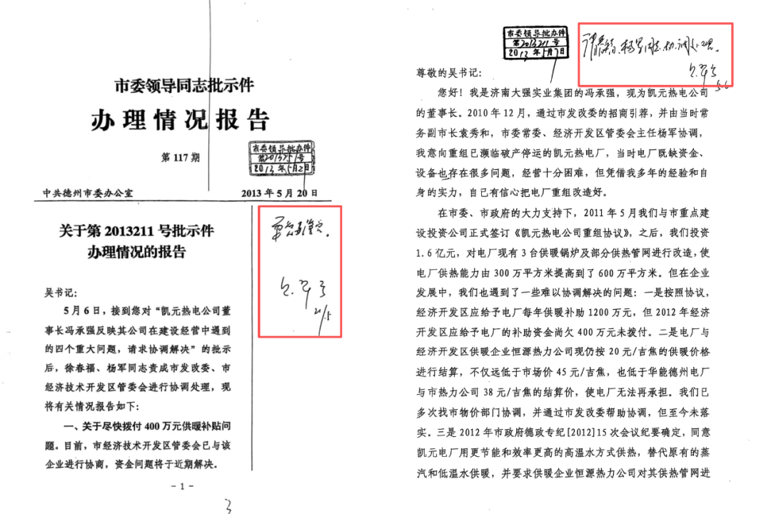 為此,馮承強(qiáng)于2013年5月3日向時任德州市委書記吳翠云遞交了一份書面報告,請求凱元熱電與外包公司恒源熱力執(zhí)行“同城同價”結(jié)算。凱元熱電在報告中提到,“電廠與恒源熱力現(xiàn)仍按20元/吉焦的供暖價格進(jìn)行結(jié)算,遠(yuǎn)低于華能德州電廠與市熱力公司38元/吉焦的結(jié)算價,使電廠無法再承擔(dān)。我們多次找市物價部門、發(fā)改委協(xié)調(diào),至今仍未落實。”2013年5月6日,時任德州市委書記吳翠云作出批示,請市政府相關(guān)領(lǐng)導(dǎo)協(xié)調(diào)處理(如下圖右紅框)。