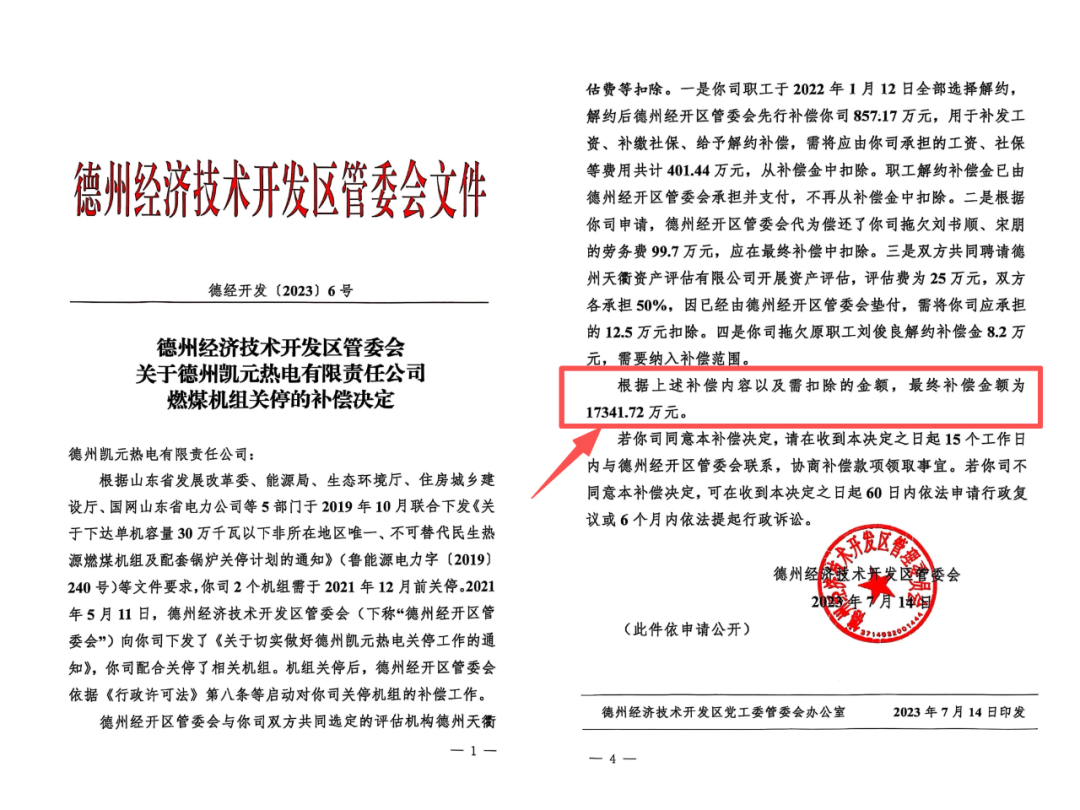 白鹿新聞注意到,德州經(jīng)開區(qū)管委會在2021年5月11日下達(dá)的《關(guān)停通知》中并未提到善后補(bǔ)償?shù)葐栴},只要求凱元熱電須在“2021年12月底前”關(guān)停的時間。但《關(guān)停通知》引用的“關(guān)停依據(jù)”《德州市發(fā)改委等四部門關(guān)于進(jìn)一步做好凱元熱電關(guān)停工作的通知》中卻提到,要求區(qū)管委會“盡快研究制定資產(chǎn)處置、人員安置等方案”。