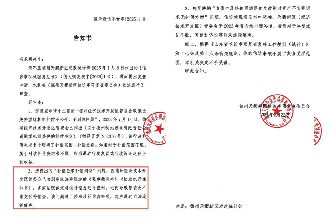 對于這筆1.73億元補(bǔ)償款不能撥付到位的原因,天衢新區(qū)信訪事項復(fù)查委員會在今年2月22日發(fā)給馮承強(qiáng)的《告知書》寫道,“因德州經(jīng)開區(qū)管委會已收到多家法院送達(dá)的民事裁定書,多家法院裁定對該補(bǔ)償金進(jìn)行查封,進(jìn)而導(dǎo)致管委會不能支付。”“你反映的直供電及熱價同城同價等訴求無補(bǔ)償方案問題,你可通過訴訟等司法途徑解決(如下圖)?!睆倪@個回復(fù)可以看出,德州經(jīng)開區(qū)基本認(rèn)同了這筆1.73億元的預(yù)付補(bǔ)償金。