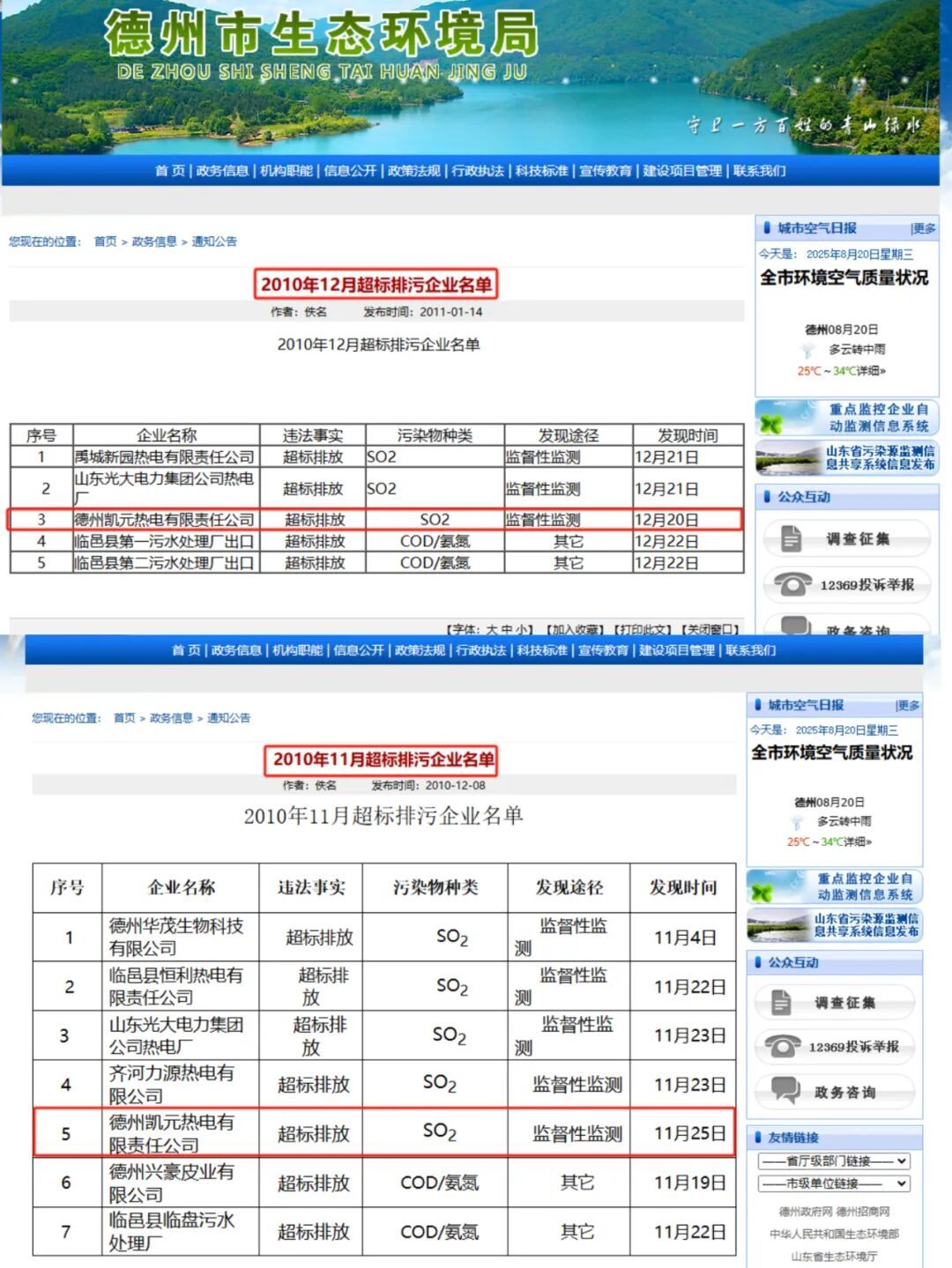 白鹿新聞還了解到,原凱元熱電早前還存在嚴(yán)重污染環(huán)境現(xiàn)象。經(jīng)查詢德州市生態(tài)環(huán)境局官網(wǎng),僅2010年一年,德州市環(huán)保局曾三次(6月2日、11月25日、12月20日)通過監(jiān)督性監(jiān)測發(fā)現(xiàn)凱元熱電因違法超標(biāo)排放二氧化硫(SO2)上了《超標(biāo)排污企業(yè)名單》(如下圖)。其間2009年11月4日,時任德州市環(huán)保局黨組書記、局長吳文群曾陪同省環(huán)保廳領(lǐng)導(dǎo)到凱元熱電等企業(yè)實地走訪,了解企業(yè)污染治理設(shè)施及污染源在線監(jiān)控設(shè)備運行情況,并與企業(yè)負(fù)責(zé)人深入交談。
