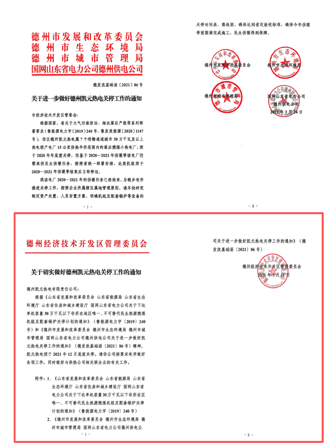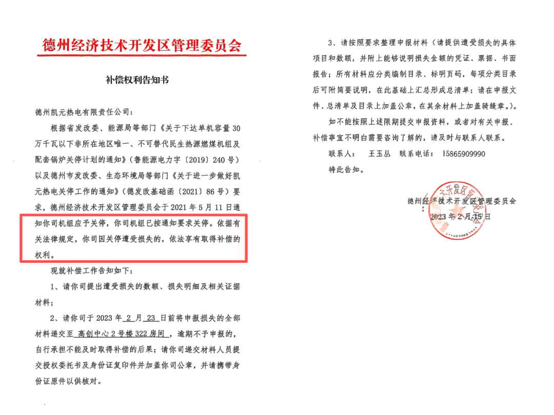 2021年5月11日,德州經(jīng)開區(qū)管委會向凱元熱電下達(dá)了《關(guān)于切實做好凱元熱電關(guān)停工作的通知》(以下簡稱:《關(guān)停通知》),根據(jù)《關(guān)停通知》要求,凱元熱電須于2021年12月底前關(guān)停(如下圖下紅框)。