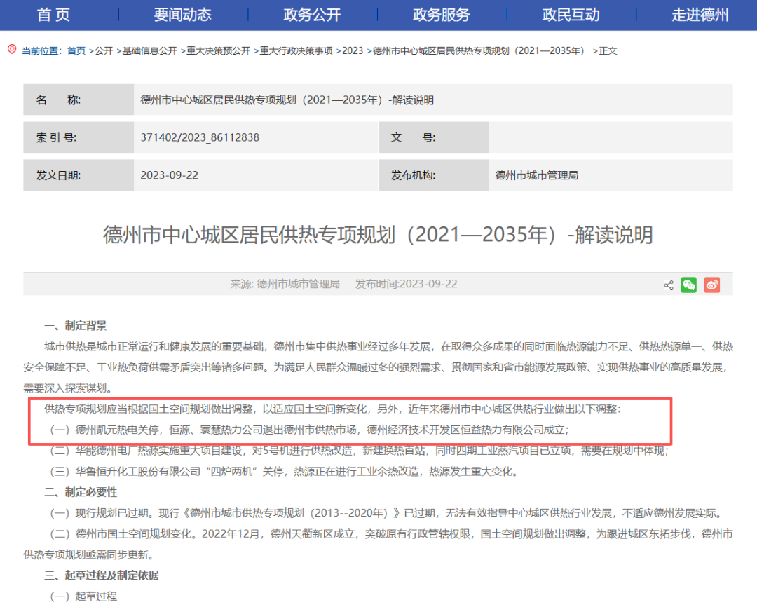 隨后的2023年9月22日,作為德州市中心城區(qū)供熱主管部門的德州市城管局在市政府網(wǎng)站發(fā)布的《德州市中心城區(qū)居民供熱專項規(guī)劃(2021—2035年)-解讀說明》中也提到,近年來德州市中心城區(qū)供熱行業(yè)做出調(diào)整:德州凱元熱電關(guān)停,恒源熱力、寰慧熱力【中環(huán)寰慧(德州)節(jié)能熱力有限公司】退出德州市供熱市場,恒益熱力成立(如下圖)。而在此“解讀說明”之前,德州市城管局在其編制的《德州市中心城區(qū)城市供熱專項規(guī)劃(2021—2035年)說明書(征求意見后修改稿)》中也明確指出,恒益熱力主要利用寰慧熱力及恒源熱力供熱管網(wǎng),承擔(dān)德州經(jīng)開區(qū)全部區(qū)域熱負(fù)荷。