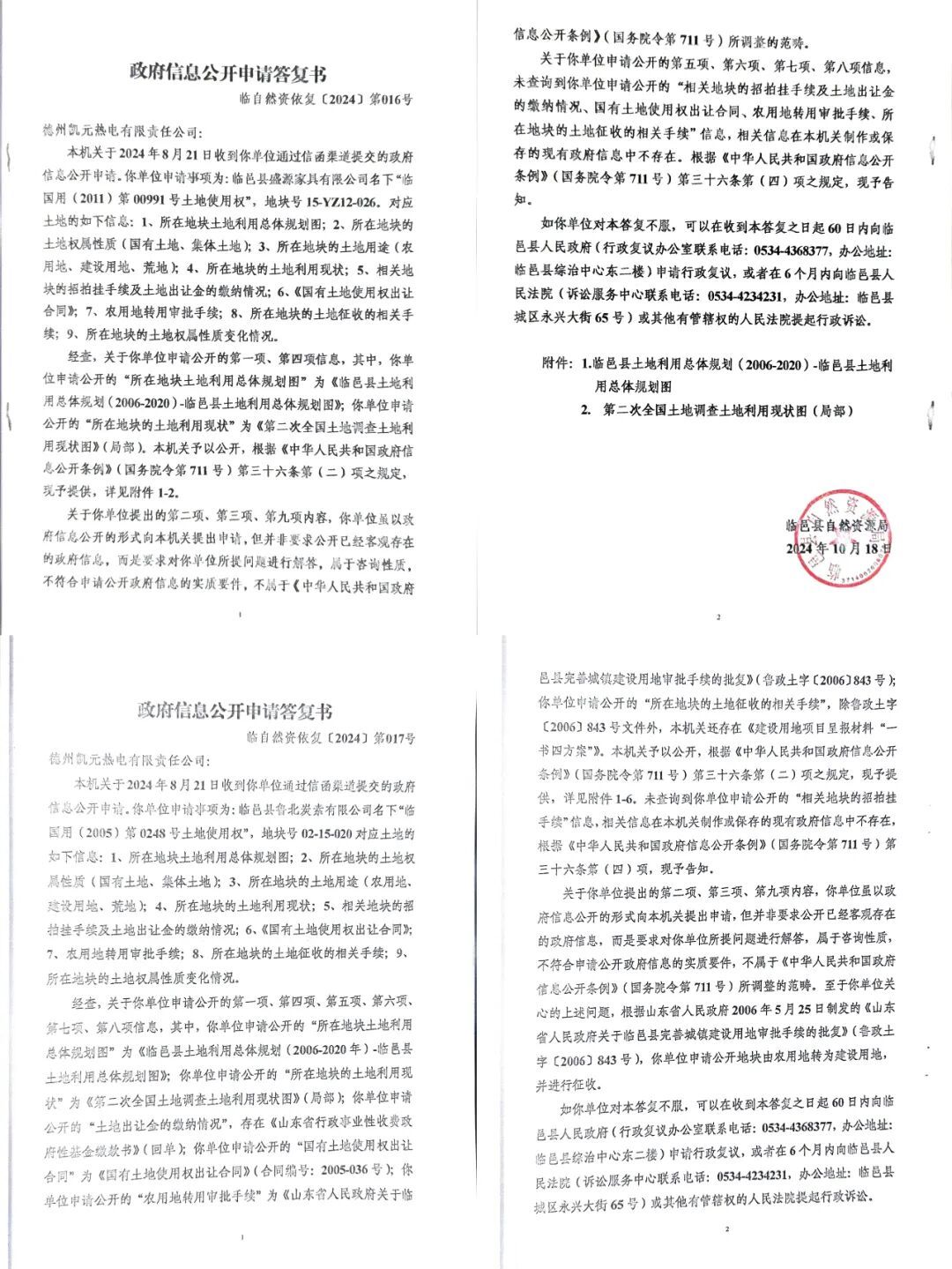 2024年10月18日,臨邑縣自然資源局亦向凱元熱電公司作出答復(fù)稱,未查詢到盛源家具名下相關(guān)地塊的招拍掛手續(xù)及土地出讓金的繳納情況、國有土地使用權(quán)出讓合同、農(nóng)用地轉(zhuǎn)用審批手續(xù)、土地征收的相關(guān)手續(xù)信息,相關(guān)信息不存在。此外,該局2024年9月18日作出的另一份答復(fù)顯示,盛源家具公司房屋的建設(shè)工程規(guī)劃許可證等資料也不存在(如下圖)。