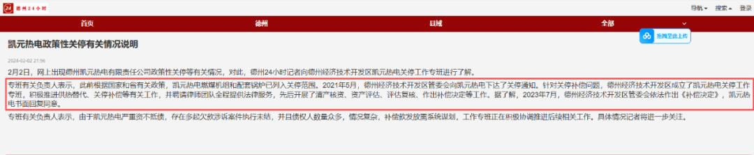 山東省委機(jī)關(guān)報《大眾日報》在2023年2月15日發(fā)表的《德州“雙輪驅(qū)動”推動能源綠色低碳轉(zhuǎn)型》一文中也有“克服重重困難,全市全面完成凱元熱電等9臺共計9.1萬千瓦落后燃煤機(jī)組關(guān)停淘汰任務(wù)”的表述。同年12月《德州日報·天衢新區(qū)版》刊發(fā)《我區(qū)入選全國首批碳達(dá)峰試點園區(qū)》文章也提到,“實現(xiàn)凱元熱電2.7萬千瓦機(jī)組關(guān)停,完成全區(qū)范圍內(nèi)窯爐改造升級?!币虼?,德州市中院、山東省高院在上述民事糾紛案中也一致認(rèn)定“凱元熱電已經(jīng)全部關(guān)停,不再運營”。