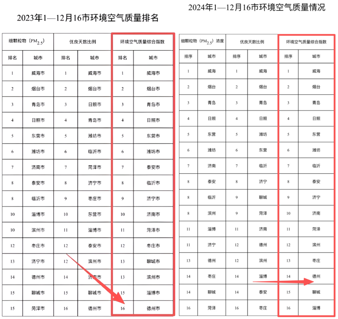 德州通過近幾年的大力關(guān)停淘汰落后小煤電機(jī)組的環(huán)境整治,其空氣質(zhì)量狀況反而不容樂觀且不降反升。白鹿新聞查詢山東省生態(tài)環(huán)境廳官網(wǎng)公布的歷年《全省環(huán)境空氣質(zhì)量狀況》顯示,近3年,德州在全省16個地級市中的“空氣質(zhì)量綜合指數(shù)”排名均處于后5位,其中2023年排名全省倒數(shù)第一,2024年倒數(shù)第三(如下圖)。