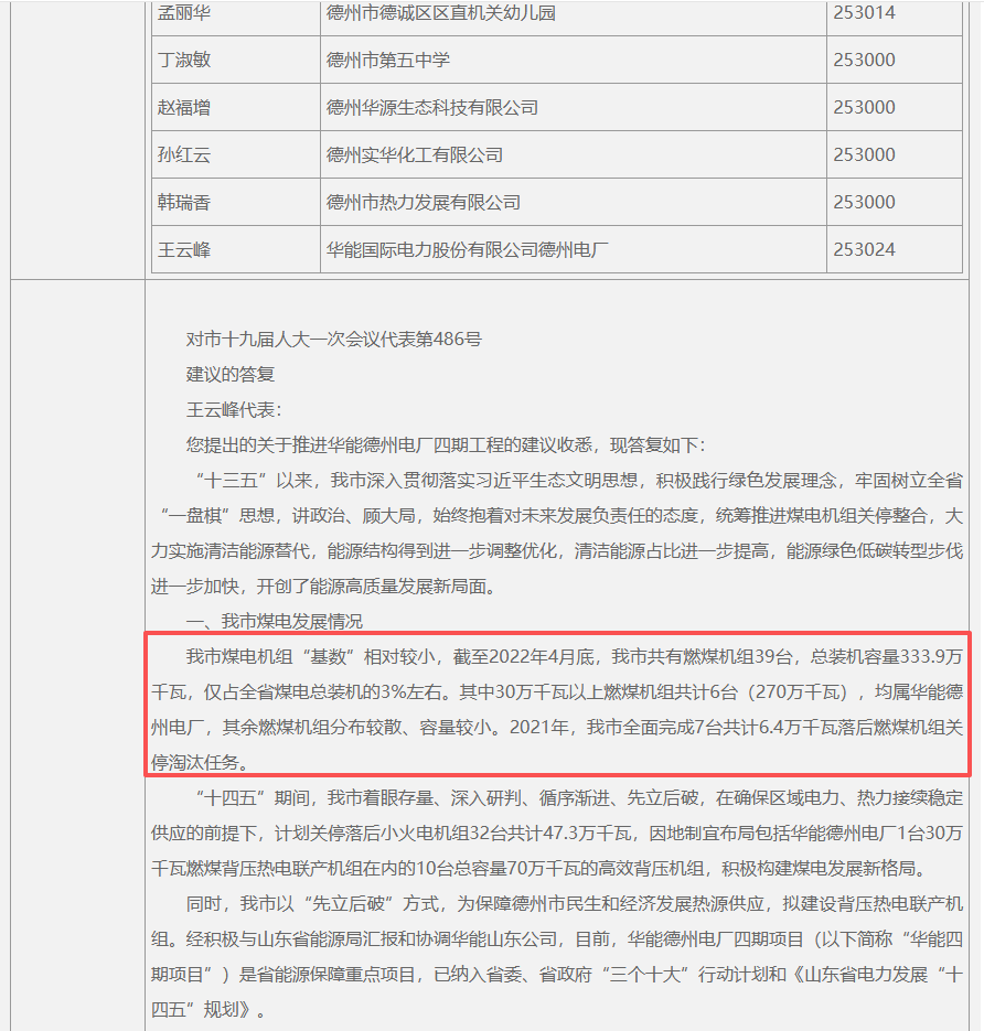 據(jù)德州市發(fā)改委2022年5月30日給市人大代表王云峰回復(fù)的《第486號 關(guān)于推進(jìn)華能德州電廠四期工程的議案轉(zhuǎn)建議的答復(fù)》(以下簡稱《議案建議》)顯示,德州市煤電機(jī)組“基數(shù)”相對較小,截至2022年4月底,全市共有燃煤機(jī)組39臺(總裝機(jī)容量333.9萬千瓦),僅占全省煤電總裝機(jī)的3%左右,其中30萬千瓦以上燃煤機(jī)組共計6臺(270萬千瓦),均屬華能德州電廠(如下圖)。