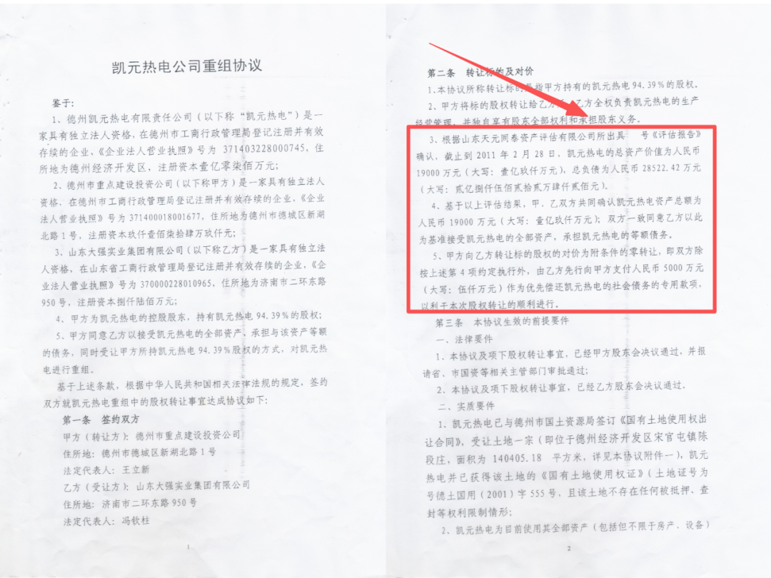 馮承強(qiáng)稱,簽訂重組協(xié)議時,為配合政府盡快進(jìn)行產(chǎn)權(quán)掛牌,基于對市政府和發(fā)改委的充分信任,大強(qiáng)集團(tuán)在未正式交接的情況下配合在評估報告上蓋章,可接管后卻發(fā)現(xiàn)很多對外債權(quán)無法收回,固定資產(chǎn)也不實。為此,德州重投公司根據(jù)重組協(xié)議要求提前將凱元熱電的100%股權(quán)轉(zhuǎn)讓給了大強(qiáng)集團(tuán)。企查查顯示,2012年8月23日,凱元熱電的100%股權(quán)由原德州重投公司變更為大強(qiáng)集團(tuán)。
