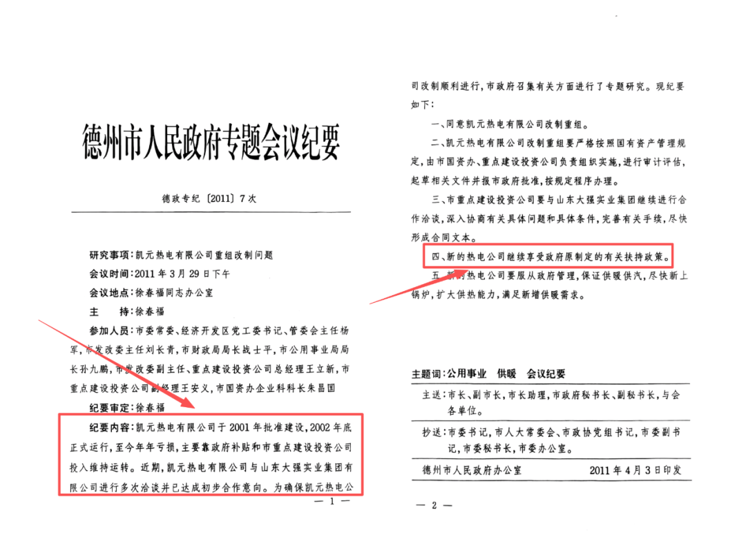 為推動項目順利落地,德州市政府隨后專門就“凱元熱電重組改制問題”召開了專題會議,一致同意大強(qiáng)集團(tuán)收購凱元熱電,并形成了上述《政府會議紀(jì)要》。會議紀(jì)要明確了“新的熱電公司繼續(xù)享受政府原制定的有關(guān)扶持政策”(如上圖右紅框)。