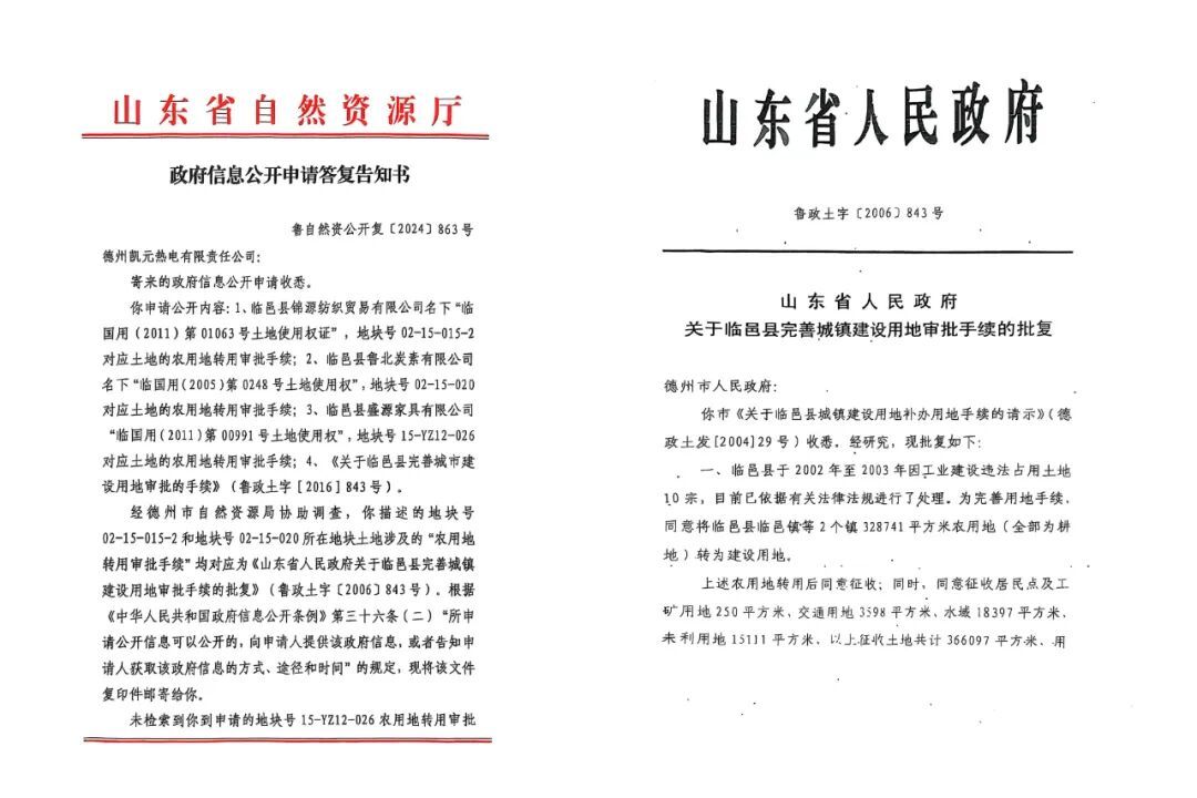 2024年9月14日,山東省自然資源廳作出的一份答復(fù)告知書及附件顯示,經(jīng)德州市自然資源局協(xié)助調(diào)查,錦源紡織和魯北炭素抵押土地涉及的“農(nóng)用地轉(zhuǎn)用審批手續(xù)” 均對應(yīng)為《山東省人民政府關(guān)于臨邑縣完善城鎮(zhèn)建設(shè)用地審批手續(xù)的批復(fù)》(魯政土字〔2006〕843號),兩塊土地早先都是工業(yè)建設(shè)違法占地,2006年5月經(jīng)該批復(fù)獲準(zhǔn)由耕地轉(zhuǎn)為建設(shè)用地(如下圖)。而盛源家具抵押的土地,則查不到農(nóng)用地轉(zhuǎn)用審批手續(xù)。