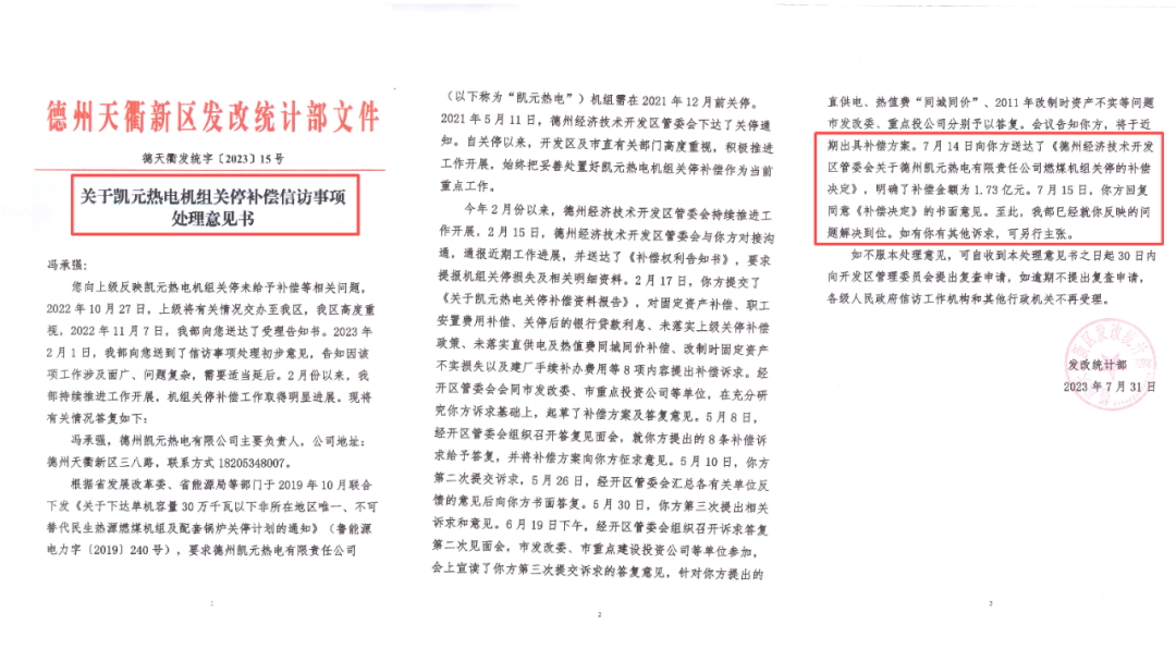 此后,雙方經(jīng)過多輪溝通協(xié)商,均未達(dá)成一致補(bǔ)償意見。為了討說法,馮承強(qiáng)多次去北京上訪,但問題均未得到實質(zhì)性的解決,原因是凱元熱電之前已“同意”《補(bǔ)償決定》中的補(bǔ)償方案。據(jù)德州天衢新區(qū)發(fā)改統(tǒng)計部向馮承強(qiáng)出具的多份《關(guān)于凱元熱電機(jī)組關(guān)停補(bǔ)償信訪事項處理意見書》中均提到,“(2023年)7月14日向你方送達(dá)了《補(bǔ)償決定》,明確了補(bǔ)償金額為1.73億元。7月15日,你方回復(fù)同意《補(bǔ)償決定》的書面意見。至此,我部已經(jīng)就你反映的問題解決到位。如你有其他訴求,可另行主張(如下圖)?!?/p>