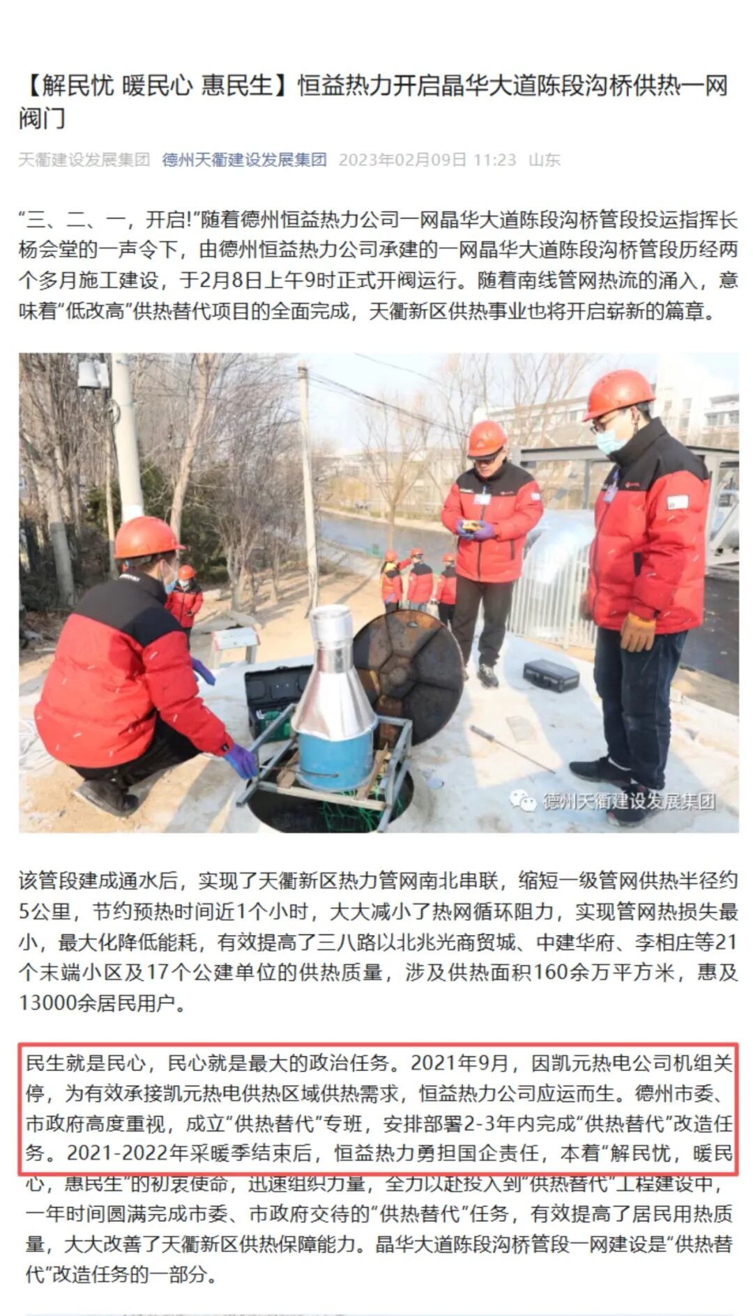 白鹿新聞從一些公開報道及德州市政府網(wǎng)站發(fā)布的官方信息中,也進(jìn)一步佐證了“恒益熱力接盤凱元熱電的供熱熱源業(yè)務(wù)”的事實依據(jù)。據(jù)《大眾日報》2021年10月22日刊發(fā)《德州凱元熱電供熱替代項目月底完工!》一文稱,2021年8月,德州市成立城區(qū)供熱及雨污分流改造提升指揮部,將凱元熱電供熱替代項目列為2021年德州市“掛圖作戰(zhàn)”重點民生項目,由德州市政府牽頭,市城管局、發(fā)改委等多部門聯(lián)合共同推進(jìn),項目建設(shè)隨即駛?cè)搿翱燔嚨馈??!盀榱思铀偻七M(jìn),德州經(jīng)濟(jì)技術(shù)開發(fā)區(qū)管委會9月份專門成立恒益熱力公司,承接(凱元熱電)供熱替代區(qū)域。”凱元熱電供熱替代項目建設(shè)指揮部姜山介紹,在此次替代項目中,恒益熱力公司承擔(dān)了128個小區(qū)單位及大型商戶、380萬平方米的供熱任務(wù),占總供熱面積的70%。而德州新聞聯(lián)播也在同一時間報道了這則消息。
