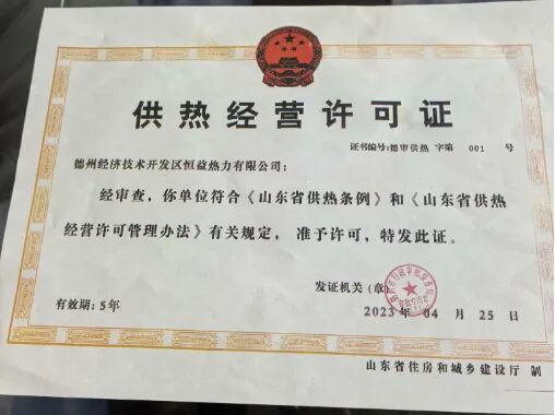 值得關(guān)注的是,白鹿新聞從德州市城管局公用事業(yè)管理科獲悉,恒益熱力運營兩年后的2023年4月25日才獲得《供熱經(jīng)營許可證》(如下圖),但根據(jù)《德州市供熱條例》第十六條規(guī)定,供熱企業(yè)應(yīng)當(dāng)在依法取得供熱經(jīng)營許可證后,方可從事供熱經(jīng)營活動。顯然,恒益熱力之前一直無證經(jīng)營,違規(guī)給經(jīng)開區(qū)轄區(qū)居民供暖。