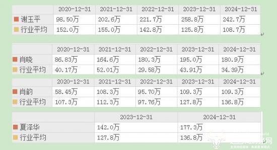 薪酬方面,盡管2024年公司整體業(yè)績表現(xiàn)較好,但多數(shù)高管薪酬不升反降。其中,總經(jīng)理謝玉平2024年薪酬由258.8萬元降至242.7萬元;財(cái)務(wù)總監(jiān)肖曉由195.0萬元降至180.9萬元。副總肖韻薪酬不變保持為109.3萬元,唯有副總經(jīng)理夏澤華實(shí)現(xiàn)漲薪,從142.0萬元提高至177.3萬元。