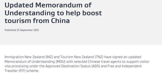 新西蘭移民局9月25日發(fā)布聲明稱,新西新西蘭已同部分中國旅行社簽署最新諒解備忘錄,蘭宣理將“被批準(zhǔn)的布縮旅游目的地國家”(ADS)和“自由行旅客”(FIT)計(jì)劃下的旅游簽證辦理周期從10天縮短至5天。