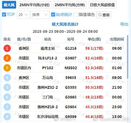 9月24日早晨,超強臺風樺加沙從珠江口南側(cè)經(jīng)過,廣東多地陣風到達12級以上,其中,珠海香洲區(qū)的廟灣主站位于臺風中心北側(cè),監(jiān)測到了17級陣風59.1米/秒)。今天白天隨著冷空氣南下,“樺加沙”強度可能會 。