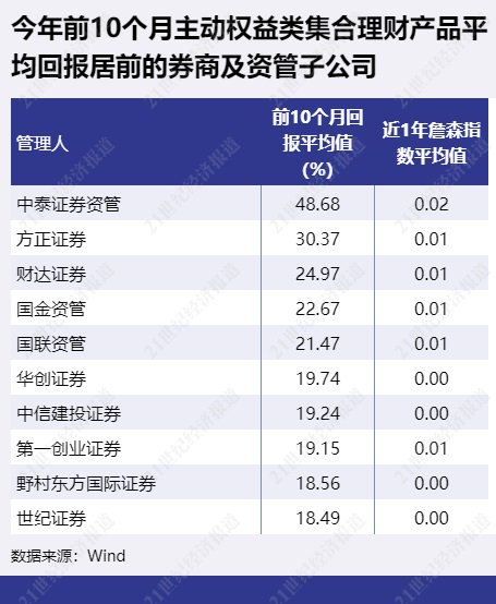 而10月此類產(chǎn)品平均回報(bào)為正收益的財(cái)達(dá)證券則實(shí)現(xiàn)排名躍升,從10名開(kāi)外躍升至第三名。
