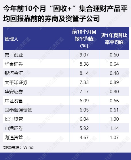 券商及資管子公司的“固收+”集合理財(cái)產(chǎn)品前10個(gè)月平均回報(bào)排名相比前三季度變動(dòng)不大,第一創(chuàng)業(yè)依然排第一,前10個(gè)月平均回報(bào)為9.07%,華金證券以8.38%排第二,銀河金匯以8.14%排第三。