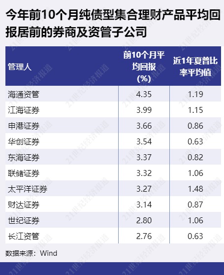 從券商及資管子公司的純債型集合理財(cái)產(chǎn)品前10個(gè)月平均回報(bào)來(lái)看,海通資管、江海證券、申港證券依然整體表現(xiàn)居前。