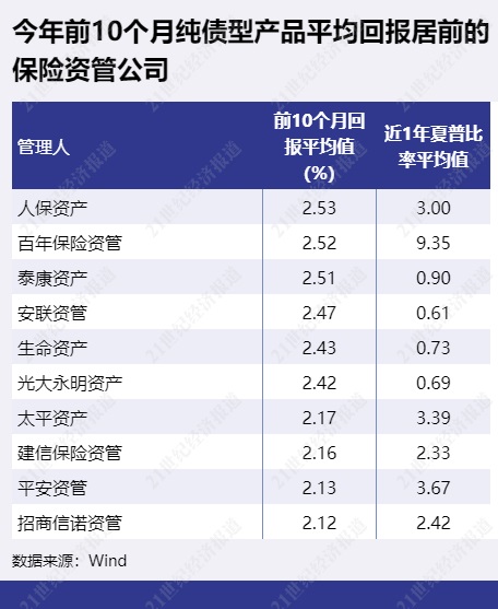 保險(xiǎn)資管公司的純債型產(chǎn)品前10個(gè)月平均回報(bào)排名也出現(xiàn)變化,人保資產(chǎn)以微弱差距奪走第一,平均回報(bào)為2.53%,百年保險(xiǎn)資管以2.52%排第二。泰康資產(chǎn)、光大永明資產(chǎn)等排名也有所上升,泰康資產(chǎn)以2.51%排第三。