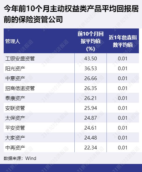 而前10個(gè)月主動(dòng)權(quán)益類產(chǎn)品平均回報(bào)靠后的保險(xiǎn)資管公司包括合眾資產(chǎn)、民生通惠、華安資產(chǎn)等。