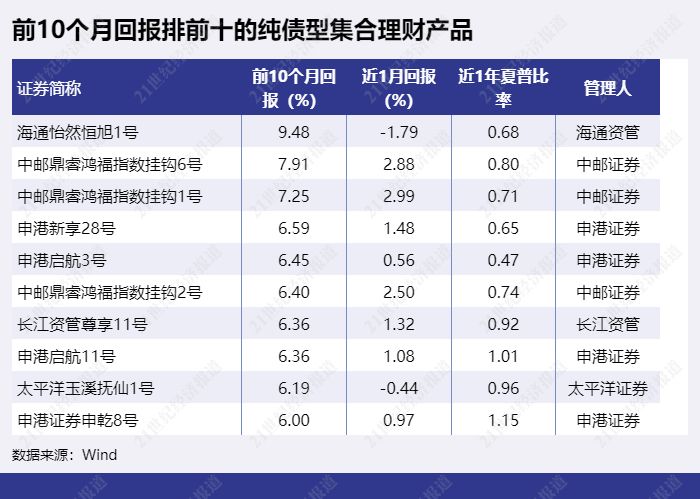 “海通怡然恒旭1號(hào)”雖然依然在純債型集合理財(cái)產(chǎn)品前10個(gè)月收益排名中排第一,債型前10個(gè)月回報(bào)為9.48%,丨資管月但10月回報(bào)為負(fù)。報(bào)月