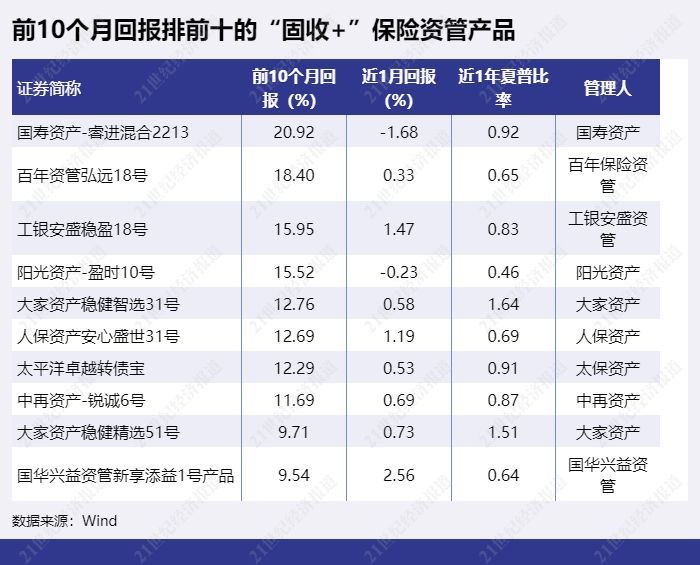 前10個(gè)月回報(bào)靠前的“固收+”保險(xiǎn)資管產(chǎn)品,也有部分產(chǎn)品10月收益為負(fù),比如前10個(gè)月回報(bào)排第一的“國(guó)壽資產(chǎn)-睿進(jìn)混合2213”,10月回報(bào)為-1.68%。“陽(yáng)光資產(chǎn)-盈時(shí)10號(hào)”10月回報(bào)為-0.23%,因此排名也略下滑。