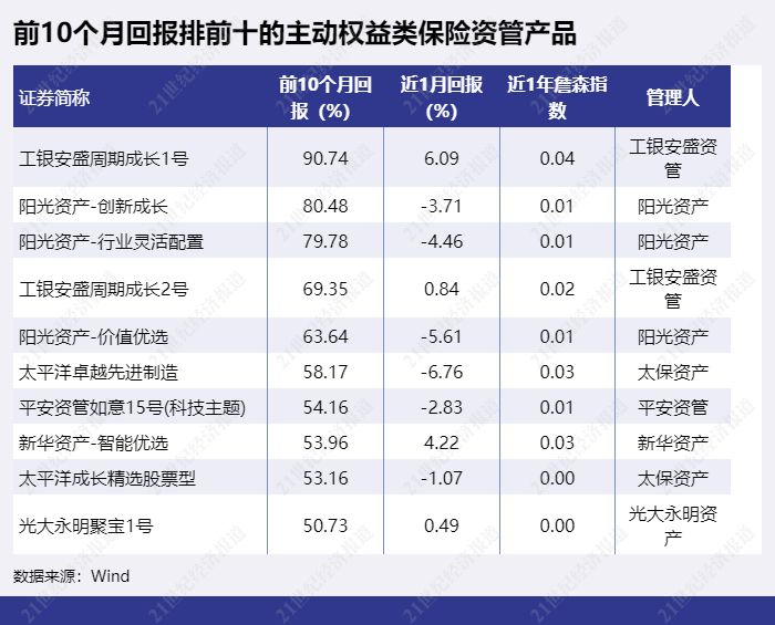 主動(dòng)權(quán)益類保險(xiǎn)資管產(chǎn)品中,“工銀安盛周期成長(zhǎng)1號(hào)”憑借10月排第一的凈值漲幅,前10個(gè)月回報(bào)達(dá)90.74%同樣排第一。