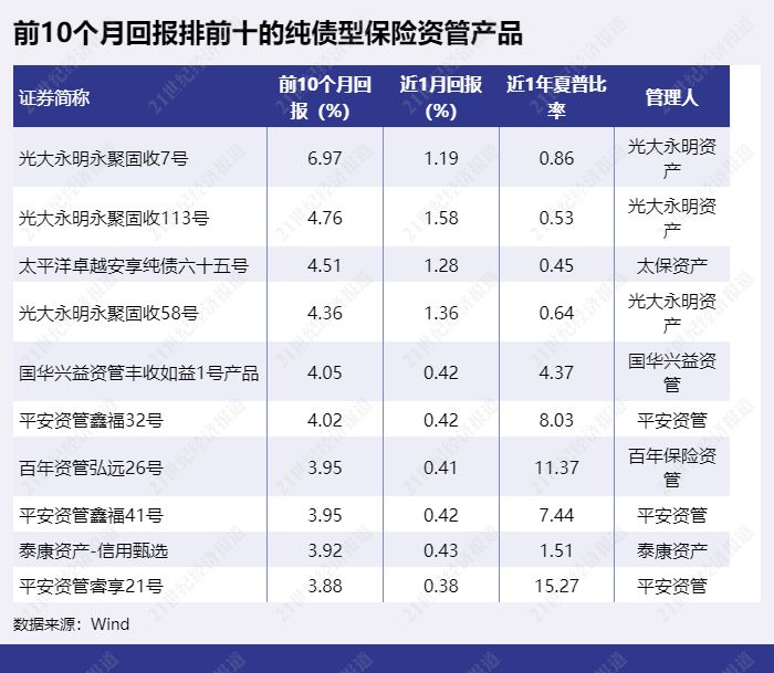 “光大永明永聚固收7號(hào)”依然在純債型保險(xiǎn)資管產(chǎn)品前10個(gè)月收益排名中排第一。