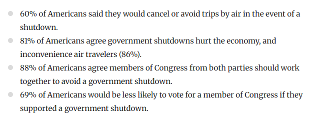 益普索 (Ipsos) 的一項(xiàng)調(diào)查顯示,60%的美國(guó)人會(huì)在政府“關(guān)門”期間取消或避免航空旅行,81%的人認(rèn)為政府停擺會(huì)損害經(jīng)濟(jì),86%的人認(rèn)為這會(huì)給旅行者帶來不便。