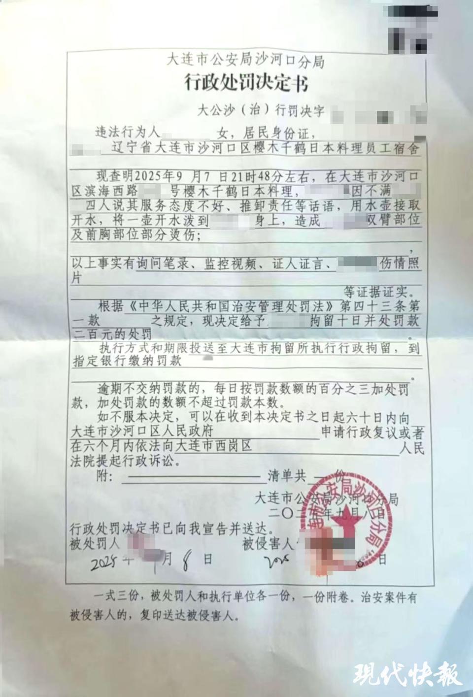 據(jù)9月8日大連市公安局沙河口分局出具的《行政處罰決定書(shū)》,經(jīng)查明,9月7日晚9時(shí)48分左右,在大連市沙河口區(qū)濱海西路一日本料理店,該服務(wù)員因不滿小沫等四人說(shuō)其服務(wù)態(tài)度不好、推卸責(zé)任等話語(yǔ),用水壺接取開(kāi)水,將一壺開(kāi)水潑到小沫身上,造成小沫雙臂部位及前胸部位部分被燙傷。依據(jù)《治安管理處罰法》,警方給予該服務(wù)員行政拘留10日,并處罰款200元。