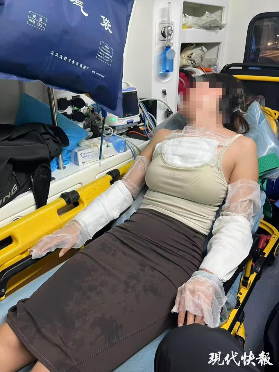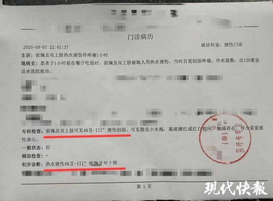 據(jù)了解,小沫遭服務(wù)員潑開(kāi)水燙傷后,被120緊急送往當(dāng)?shù)蒯t(yī)院治療。9月7日晚10點(diǎn)41分,醫(yī)院門(mén)診病歷顯示,她被診斷為“熱水燙傷4%Ⅱ-Ⅲ°前胸及雙上肢”。目前,小沫已經(jīng)返回北京,每隔兩天去醫(yī)院復(fù)查換藥。