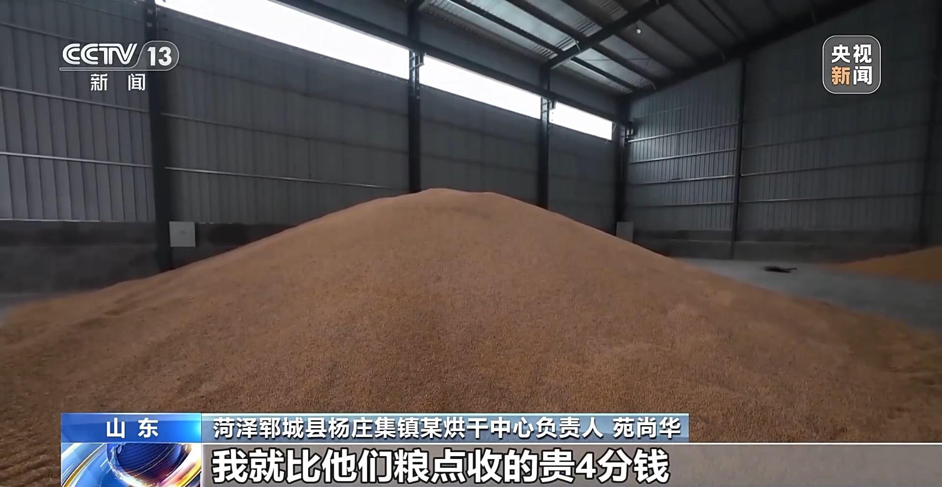 菏澤鄆城縣楊莊集鎮(zhèn)某烘干中心負(fù)責(zé)人 苑尚華:鎮(zhèn)上很重視這個(gè)事,不能給這個(gè)下面糧點(diǎn)收一樣錢,我就比他們糧點(diǎn)收的貴4分錢。