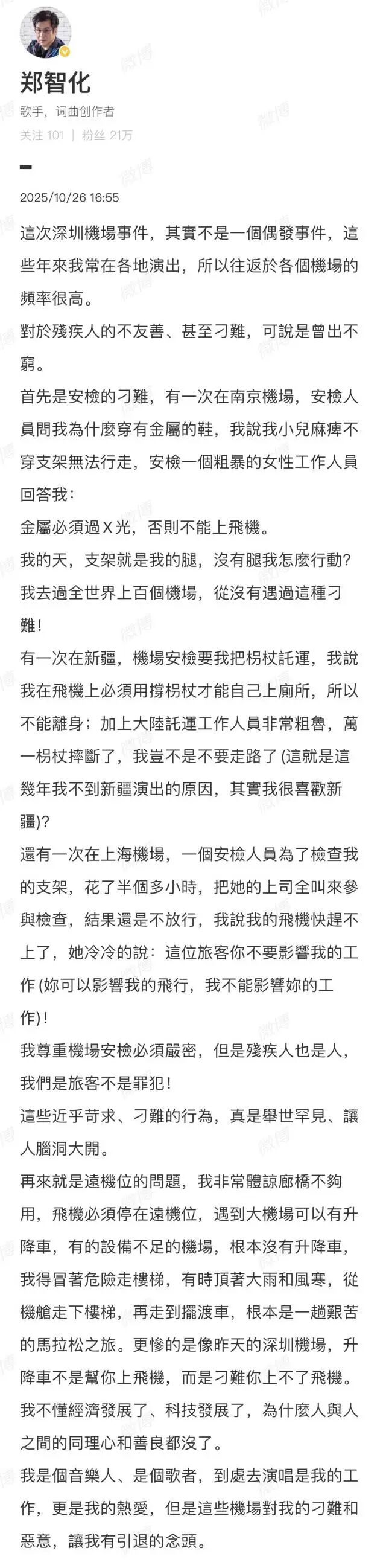 10月25日,盲人歌手鄭智化在微博發(fā)文控訴深圳機場服務存在嚴重問題,脫口稱其在登機時遭遇工作人員冷漠對待,秀演最終不得不“連滾帶爬”進入機艙,員黑引發(fā)公眾關注。鄭智