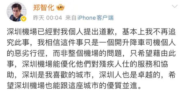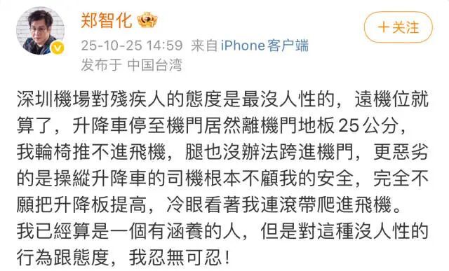 鄭智化在微博控訴深圳機場對殘疾人“態(tài)度最沒人性”,稱升降車與機艙門存在25厘米高度差,導致輪椅無法推進機艙,工作人員拒絕調整設備且“冷眼旁觀”,最終他被迫“連滾帶爬”登機。
