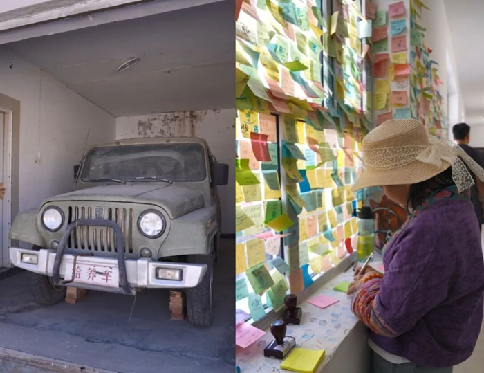 圖左:紅色教育基地里的舊卡車,圖右:游客在參觀紅色教育基地時(shí)留下感言