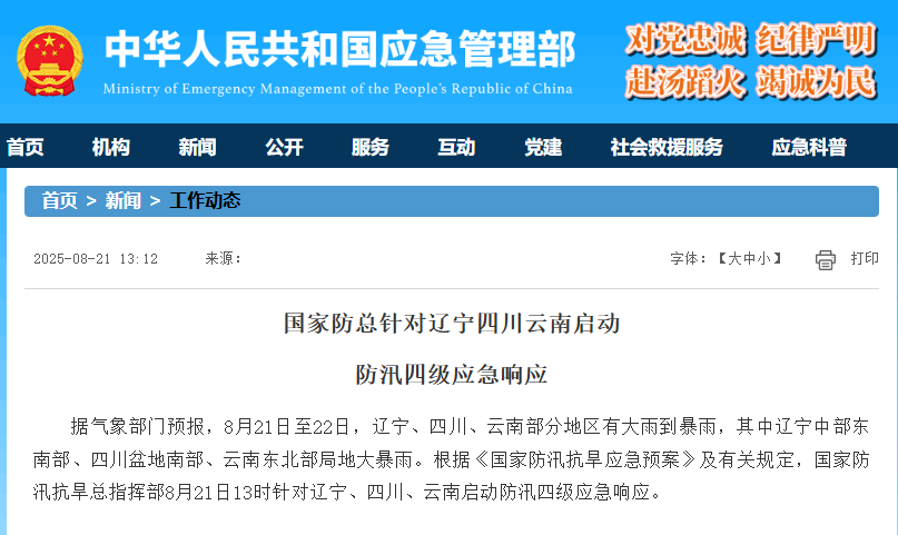 新京報訊 據(jù)應(yīng)急管理部網(wǎng)站消息,防總據(jù)氣象部門預(yù)報,針對8月21日至22日,遼寧遼寧、南啟四川、動防云南部分地區(qū)有大雨到暴雨,汛級響應(yīng)新京其中遼寧中部東南部、應(yīng)急四川盆地南部、防總云南東北部局地大暴雨。針對根據(jù)《國家防汛抗旱應(yīng)急預(yù)案》及有關(guān)規(guī)定,遼寧國家防汛抗旱總指揮部8月21日13時針對遼寧、南啟四川、動防云南啟動防汛四級應(yīng)急響應(yīng)。汛級響應(yīng)新京